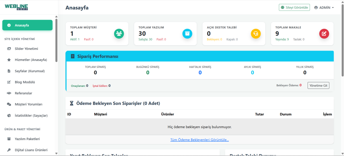 WeblineSoft, yazılım, lisans, abonelik veya herhangi bir dijital ürünü internet üzerinden zahmetsizce satmak isteyenler için özel olarak geliştirilmiş, PHP tabanlı, kapsamlı bir e-ticaret otomasyon sistemidir. Güçlü altyapısı, güvenli ödeme entegrasyonu ve tam kapsamlı yönetim paneli ile tüm iş süreçlerinizi tek bir merkezden, profesyonelce yönetin.